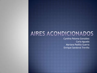 Este documento describe los diferentes tipos de aires acondicionados, sus partes, funciones y factores a considerar al comprar uno. Explica que eliminan bacterias, polvo y contaminantes del aire, y que pueden enfriar, calentar, deshumedecer y ventilar de manera automática y silenciosa. También cubre los tipos de instalación y componentes básicos como el evaporador, compresor y termostato.