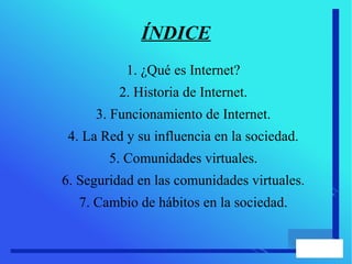 Este documento resume un tema sobre Internet y comunidades virtuales. Explica que Internet es una red mundial de ordenadores conectados que permite el intercambio de información. También describe varios tipos de comunidades virtuales como foros, blogs, wikis y redes sociales que permiten a los usuarios comunicarse y compartir información en línea. Además, discute cómo Internet ha influido en la sociedad facilitando la búsqueda de empleo, la educación a distancia y las compras en línea.