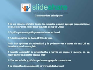 Slideshare es una aplicación web donde los usuarios pueden almacenar y compartir presentaciones de diapositivas de forma gratuita. Los usuarios pueden subir archivos de hasta 20 Mb y compartir las presentaciones a través de correos electrónicos o enlaces web. Slideshare también permite a los usuarios crear perfiles, gestionar presentaciones con etiquetas, y ver presentaciones subidas por otros.