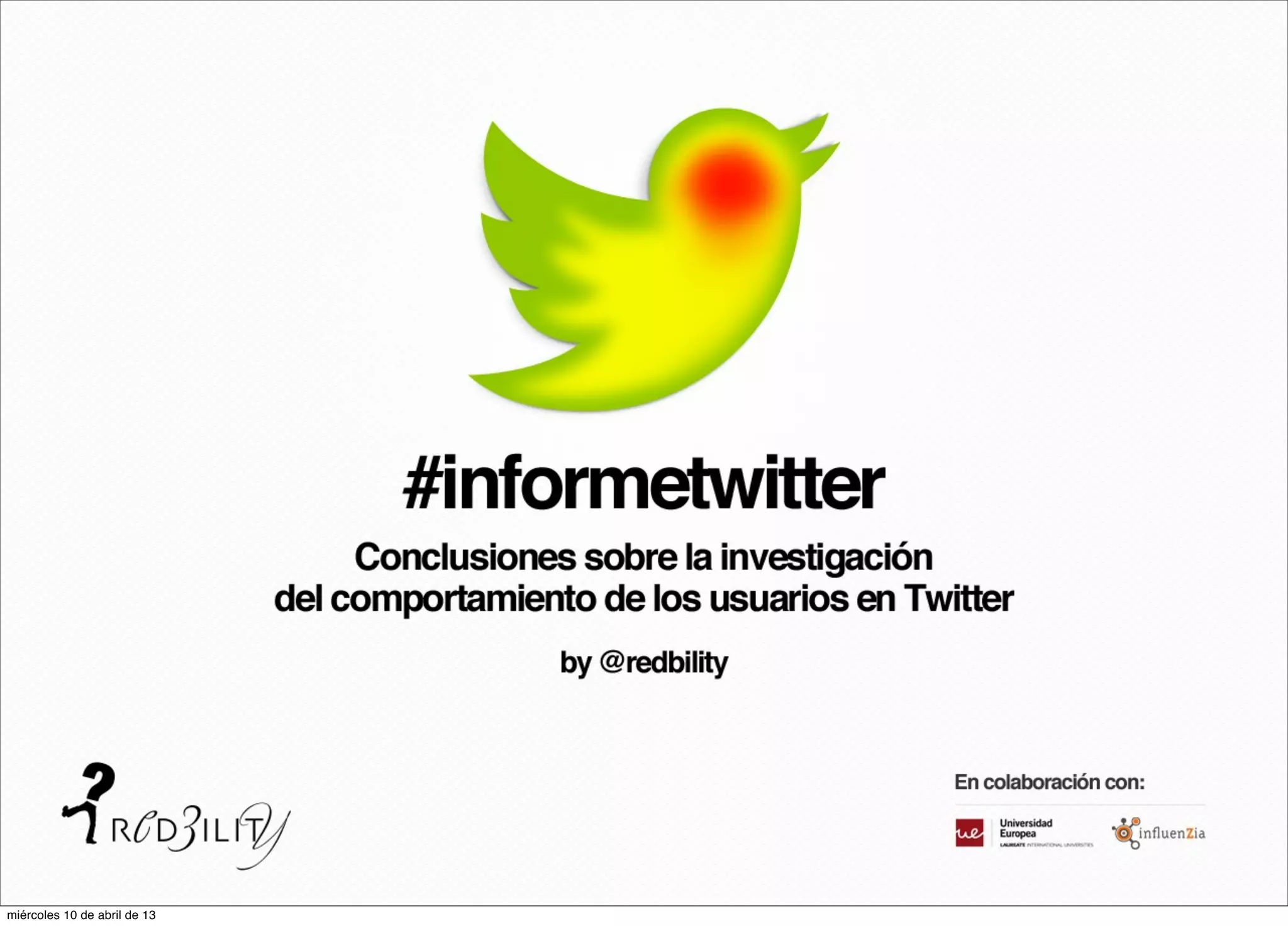 El documento analiza el comportamiento de usuarios de Twitter, enfocándose en aspectos como el 'customer journey' y la activación emocional al tuitear. Se presentan resultados sobre el consumo visual y los patrones de interacción en diferentes dispositivos, así como conclusiones sobre la efectividad del contenido y recomendaciones para mejorar la comunicación en la plataforma. Además, se segmentan los perfiles de usuarios entre profesionales en redes sociales y particulares, destacando sus diferentes objetivos y comportamientos en la red.