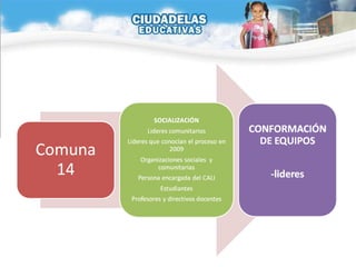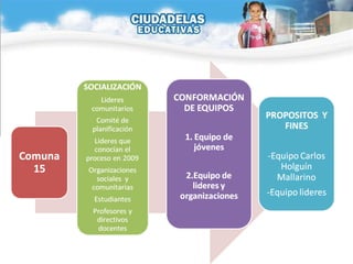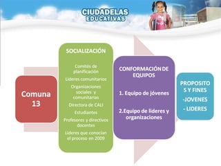 El documento describe los esfuerzos para construir un modelo educativo participativo en las comunas 13, 14 y 15 de Cali, Colombia. Se formaron equipos de jóvenes, líderes y organizaciones para recopilar información sobre los problemas, fortalezas y aspiraciones de la comunidad, con el fin de desarrollar un currículo basado en las necesidades de la comunidad. Se llevaron a cabo varias reuniones con líderes comunitarios, directores de escuelas, organizaciones sociales y otros para socializar el proyecto y comenzar el proceso