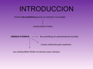 El documento resume la historia y el funcionamiento de la energía nuclear. Explica que la energía nuclear se basa en aprovechar la energía liberada por las reacciones de fisión y fusión atómica. Describe los componentes clave de una planta nuclear como el reactor, el combustible de uranio enriquecido y los procesos de generación de vapor y electricidad. También compara los impactos ambientales de las plantas nucleares versus las de carbón.