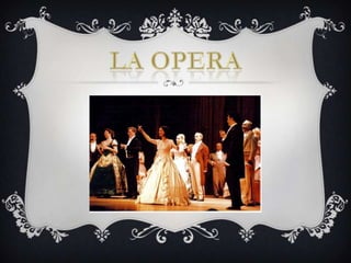 La ópera es una obra musical y teatral en la que los compositores adaptan argumentos teatrales a composiciones musicales con partes orquestales y arias cantadas por solistas. Las voces se clasifican en soprano, mezzo, contralto, tenor, barítono y bajo. Además de arias y recitativos, las óperas suelen incluir dúos, coros y una obertura instrumental introductoria. Algunas óperas famosas son Carmen, La Traviata, Rigoletto y La flauta mágica.