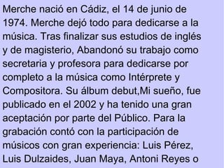 Merche nació en Cádiz en 1974 y dejó su trabajo como secretaria y profesora para dedicarse por completo a la música como intérprete y compositora. Su álbum debut Mi sueño de 2002 tuvo gran aceptación del público. Ha sacado seis discos en total, incluyendo su más reciente Acordes de mi diario de 2010, que incluye 12 temas inéditos compuestos por ella que reflejan aspectos como la ironía, la ternura y el optimismo.