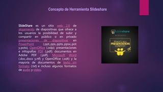 SlideShare es un sitio web que permite a los usuarios subir y compartir presentaciones de diapositivas, documentos PDF, Word y otros formatos. Los usuarios pueden configurar la privacidad de las presentaciones y usar SlideShare para comunicarse con clientes y proveedores sin tener que enviar archivos pesados por correo electrónico. SlideShare también permite incrustar presentaciones en páginas web como blogs.