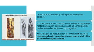 El documento aborda la tuberculosis (TB) como un importante problema de salud pública, resaltando su historia, epidemiología, fisiopatología y métodos de diagnóstico y tratamiento. Se enfatiza la necesidad de prevención y control, así como la identificación y tratamiento de los casos para disminuir la morbilidad y mortalidad. Además, se menciona la relación entre la TB y factores de riesgo como el VIH, malnutrición y hacinamiento.