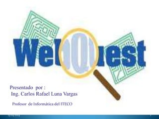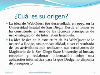 Las WebQuest surgieron en 1995 en la Universidad Estatal de San Diego como una técnica para usar e integrar Internet en la escuela. Se definen como actividades de aprendizaje guiado donde los estudiantes trabajan con recursos de Internet para resolver un problema o tarea, desarrollando habilidades cognitivas superiores. Los profesores las usan como recurso didáctico para trabajar habilidades de manejo de información y competencias de la sociedad digital.