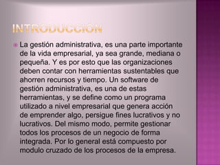 Este documento presenta información sobre software de gestión administrativa. Explica que este tipo de software permite gestionar los procesos empresariales de forma integrada para organizar los recursos y lograr los objetivos de manera eficiente. También describe algunos programas específicos como el SAIT y ASPEL, que brindan herramientas para la administración de ventas, finanzas, recursos humanos y otros procesos.