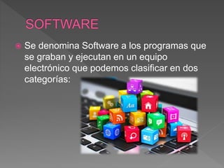El documento describe los diferentes tipos de software y sistemas operativos, incluyendo sistemas operativos como Windows, Linux, y Android. Explica que los sistemas operativos se pueden clasificar como monotarea o multitarea, monousuario o multiusuario, y monoprocesador o multiprocesador.