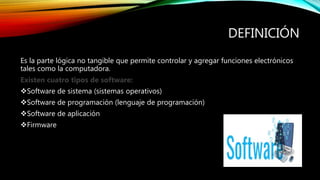 El documento define y describe los diferentes tipos de software, incluyendo software de sistema (como Windows, Linux y Android), software de programación (como PHP y C++), software de aplicación (como WordPad, Avast y Paint) y firmware. Explica que el software permite controlar y agregar funciones a dispositivos electrónicos como las computadoras y que cada tipo de software tiene una función específica.