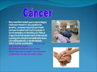 El documento habla sobre el cáncer y sus características. Explica que el cáncer se produce debido a cambios o mutaciones en el ADN que hacen que las células se multipliquen rápidamente de forma anormal. Luego describe varios tipos comunes de cáncer y los principales tratamientos contra el cáncer como la cirugía, radioterapia, quimioterapia y trasplante de médula ósea. Finalmente, anima a la persona a no dejarse vencer por la enfermedad y a luchar contra el cáncer
