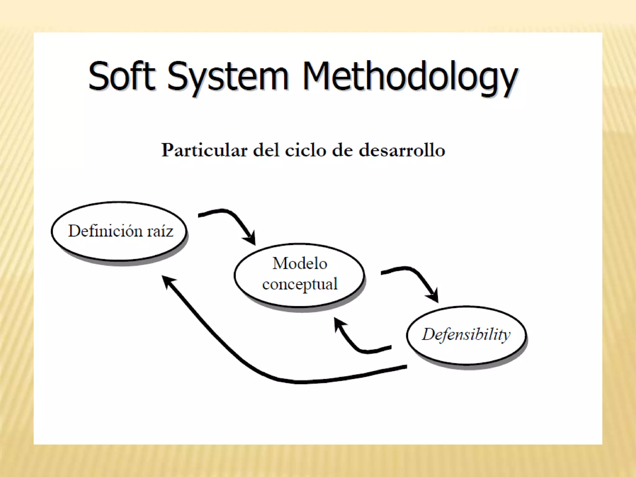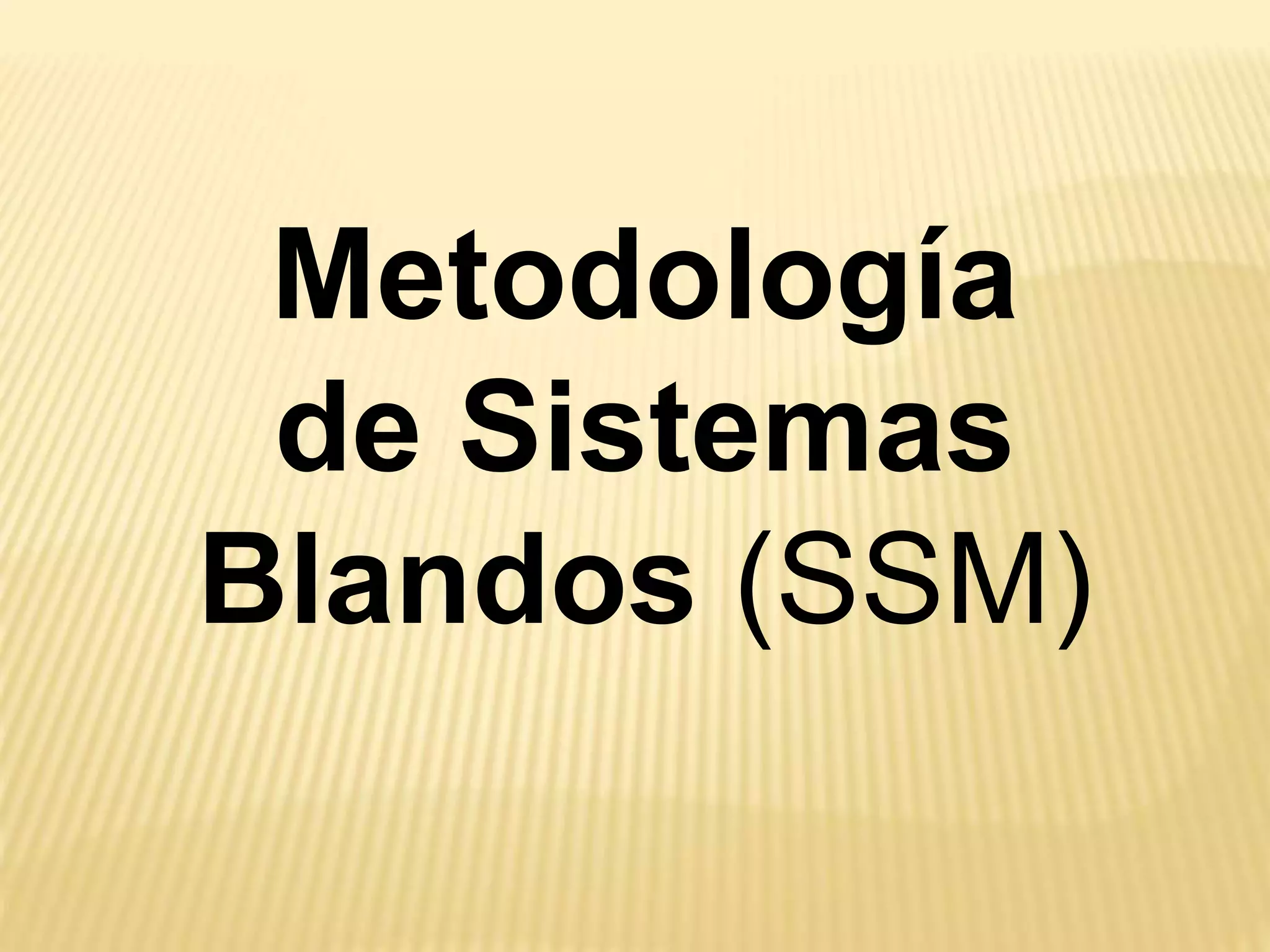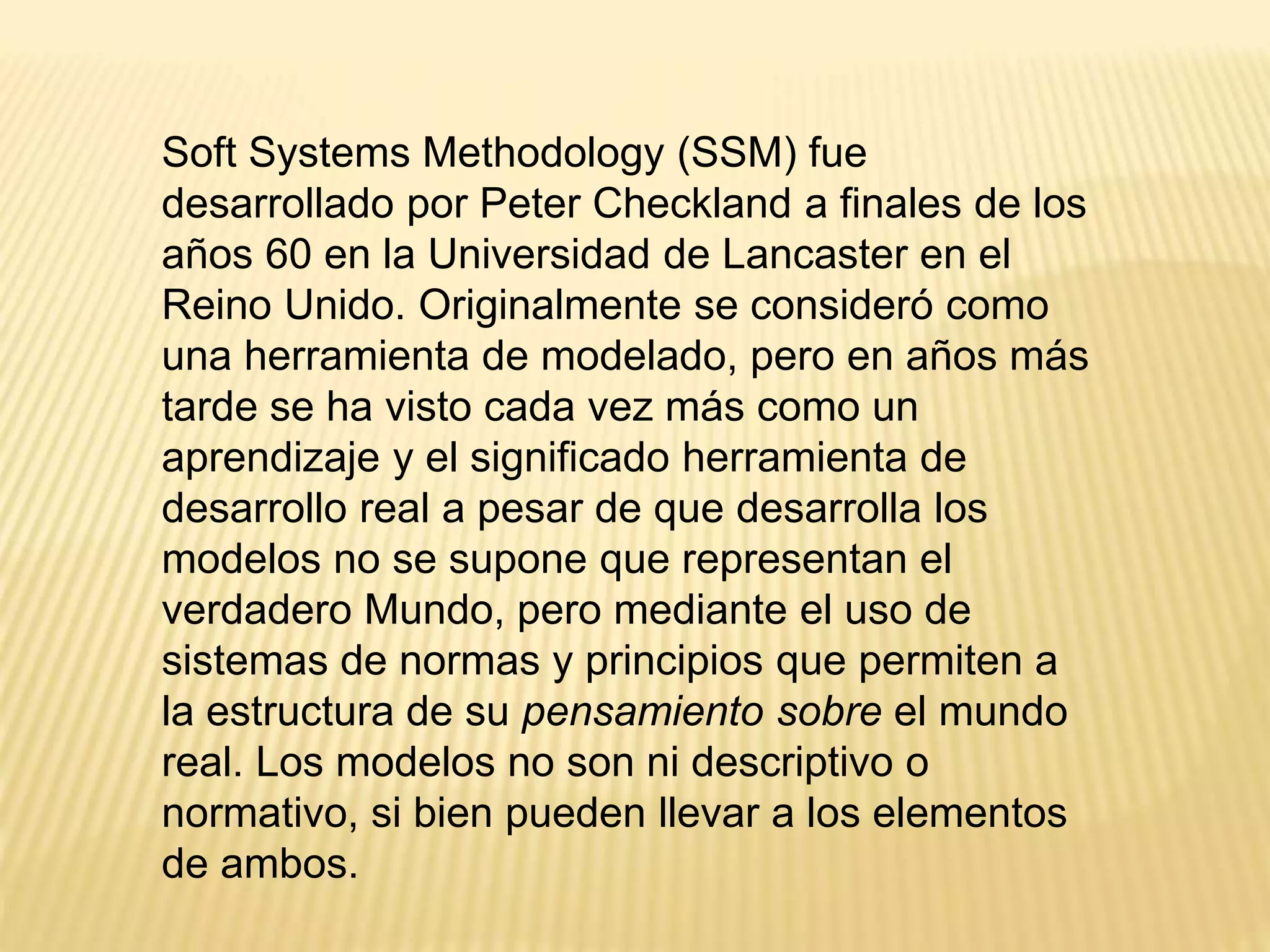 Soft Systems Methodology (SSM) fue desarrollado por Peter Checkland a finales de los años 60 como una herramienta de modelado, pero más tarde se ha visto como una herramienta de aprendizaje y desarrollo. SSM utiliza sistemas de normas y principios para estructurar el pensamiento sobre el mundo real sin pretender representarlo de manera descriptiva o normativa. La investigación SSM clásica tiene siete etapas que comparan el mundo tal como es con modelos conceptuales para lograr una mejor comprensión y ideas para la mejora.