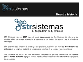 STR Sistemas es una empresa española fundada en 2007 que ofrece servicios de administración de sistemas, consultoría tecnológica, monitorización de sistemas, formación y servicios en la nube. Ofrecen servidores administrados, outsourcing de sistemas, optimización de sistemas y plataformas, administración de Amazon Web Services, monitorización de sistemas, formación y su herramienta STR Mailer para envío masivo de correo y SMS. Su enfoque es dar un servicio personalizado a cada cliente.