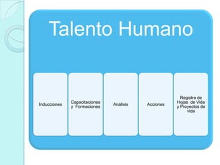 El documento describe los procesos de talento humano de una institución educativa incluyendo inducciones, capacitaciones, análisis de evaluaciones docentes, hojas de vida con logros laborales y personales, y auditorías internas.