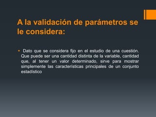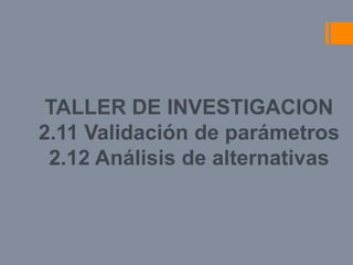 Este documento discute la validación de parámetros y el análisis de alternativas. Explica que la validación de parámetros implica determinar las características de funcionamiento de un método a través de estudios de laboratorio. También cubre los tipos de ensayos que se deben considerar y que la validez debe realizarse preferiblemente con métodos estadísticos. Por último, destaca la importancia de analizar todas las posibles alternativas de solución a un problema para diferenciar el proyecto de otros.