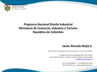 El documento presenta un taller sobre diseño industrial y estrategia como medio para lograr reconocimiento de marca organizado por el Programa Nacional de Diseño Industrial del Ministerio de Comercio, Industria y Turismo de Colombia. El taller abordará temas como la investigación, el diseño, la innovación y su relación con la competitividad empresarial y el reconocimiento de marca a nivel regional y nacional.