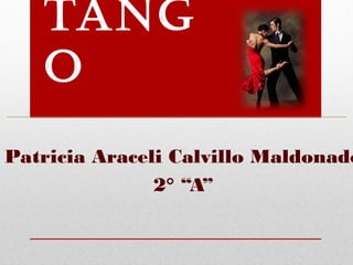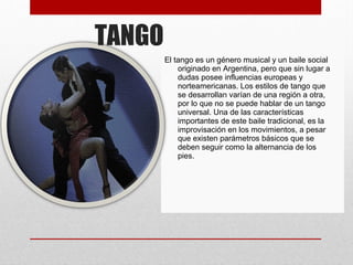El documento describe el origen y evolución del tango. Explica que el tango se originó en Argentina pero tiene influencias de Europa y América del Norte. Además, describe que la palabra "tango" proviene del idioma de los esclavos africanos llevados a Argentina y se refería a lugares de reunión. Finalmente, señala que el tango fue introducido en España por Carlos Gardel en 1923.