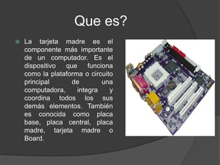 La tarjeta madre es el componente principal de una computadora que integra y coordina todos los demás elementos. Contiene conectores para el procesador, memoria RAM, BIOS, puertos, expansión de memoria y otros componentes. Las principales partes de la tarjeta madre incluyen el socket del procesador, ranuras para tarjetas de expansión e interfaces para dispositivos de almacenamiento como el disco duro.