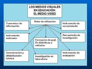 El documento describe varios usos educativos del video. Puede usarse como transmisor de información de manera motivadora y progresiva, o como herramienta para que los estudiantes creen sus propios videos y aprendan de manera colaborativa. También puede usarse para la evaluación, formación de profesores, e investigación educativa al permitir el análisis de procesos cognitivos y situaciones de aprendizaje.
