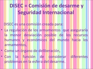 La comisión DISEC fue creada por la ONU para regular el control de armamentos y desviar recursos de las armas. Examina problemas relacionados con el desarme. América Latina está aumentando sus gastos militares, de $29.1 mil millones en 2003 a $39.6 mil millones en 2008. Esto genera tensiones entre los países. Un tema de simulación podría ser la carrera armamentista en la región. Otro tema podría ser las bases militares estadounidenses en Latinoamérica, un tema polémico que involucra
