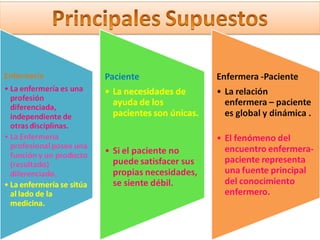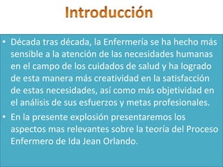 La teoría de Ida Jean Orlando se centra en la relación entre enfermera y paciente. Explica que la función de la enfermería es descubrir las necesidades inmediatas de ayuda del paciente y satisfacerlas para aliviar su malestar. La teoría se basa en el análisis de 2000 interacciones entre enfermeras y pacientes y se centra en cómo la conducta del paciente puede mejorar tras la acción de la enfermera.