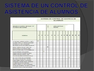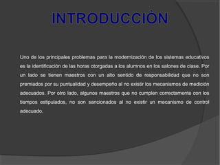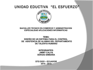 Este documento describe un proyecto para diseñar un sistema automatizado de control de asistencia para los alumnos de la Unidad Educativa “El Esfuerzo” en Santo Domingo, Ecuador. El sistema se desarrollará usando Microsoft Excel y permitirá registrar la entrada y salida de los maestros para incentivar la puntualidad. El sistema ayudará a mejorar los procesos en el Departamento de Talento Humano al agilizar tareas como la asignación de clases y registro de notas.