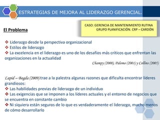 Este documento propone estrategias para mejorar los estilos de liderazgo en el grupo de Planificación de Mantenimiento Rutina de la Gerencia de Mantenimiento Rutina en el Centro de Refinación Paraguaná - Cardón. Analiza los estilos de liderazgo conductual y transformacional mediante encuestas y observación, con el objetivo de diagnosticar la influencia del grupo y formular acciones estratégicas que generen sinergia y proactividad.