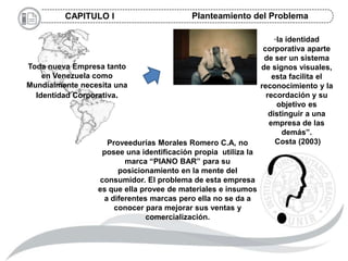 Este documento presenta una propuesta para un manual de identidad corporativa dirigido a la empresa Proveedurías Morales Romero C.A. Se analizan los elementos de la imagen corporativa de la empresa y se proponen características gráficas como un nuevo logotipo, tipografía y colores. Finalmente, se presenta un borrador del manual de identidad corporativa con la misión de la empresa y otros lineamientos para estandarizar el uso de su marca.
