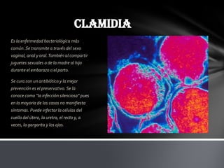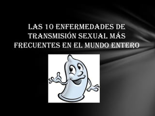 Este documento resume las 10 enfermedades de transmisión sexual más comunes a nivel mundial: clamidia, gonorrea, sífilis, herpes genital, VIH/SIDA, tricomoniasis, condilomas (HPV), candidiasis, ladillas y sarna. Se describe cómo se transmiten estas enfermedades, sus síntomas y formas de prevención.