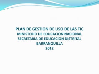 Este documento presenta el plan de gestión de uso de las TIC del Ministerio de Educación Nacional para una escuela en Barranquilla para el año 2012. El plan establece una visión de que para el 2015 la escuela será reconocida por tener programas de competencias laborales, mejorar desempeño académico, promover sostenibilidad ambiental y fomentar interacción a través de TIC. La misión es formar estudiantes de manera integral usando valores, tecnología, arte y formación laboral. El plan describe estrategias de direccionamiento