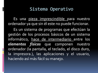 El documento describe las funciones y características principales de los sistemas operativos. Explica que un sistema operativo es un programa que gestiona los recursos de un ordenador y facilita la interacción entre el hardware, software y usuario. También describe las interfaces gráficas de usuario, funciones básicas como la gestión de procesos y recursos, y los tipos de sistemas operativos como monousuario, multiusuario, de propósito general y en tiempo real.