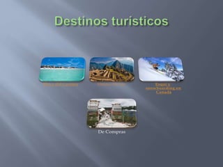 El documento presenta varias opciones de destinos turísticos para disfrutar de actividades recreativas como esquiar, visitar sitios históricos y realizar compras. Menciona lugares en Canadá como Vancouver, Whistler y Banff/Lake Louise para esquiar, y destaca las ruinas de Machu Picchu en Perú. También resalta varias avenidas y distritos en París conocidos por sus tiendas y marcas de lujo.