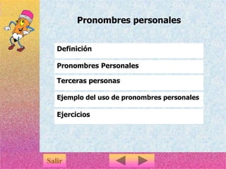 El documento explica los pronombres personales en inglés, incluyendo las formas de I, you, he, she, it, we y they. También discute las terceras personas y cómo los verbos varían de acuerdo al género. Finalmente, presenta algunos ejercicios para practicar el uso correcto de los pronombres personales en oraciones.