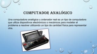 El documento describe diferentes tipos de computadoras, incluyendo computadoras analógicas que usan dispositivos físicos para modelar problemas, computadoras híbridas que tienen características analógicas y digitales, supercomputadoras con capacidades de cálculo muy altas, y computadoras centrales, minicomputadoras, microcomputadoras, de escritorio, personales y domésticas que varían en tamaño y propósito. También describe computadoras portátiles, subportátiles, ultra móviles, PDAs, smartphones, client