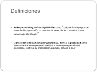 Este documento define la publicidad y describe varios tipos, incluyendo publicidad de marca, detallista, B2B, sin fines de lucro y de respuesta directa. La publicidad se define como una forma pagada de promoción no personal de ideas, bienes o servicios por un patrocinador identificado. Los tipos de publicidad se diferencian por su enfoque, como la publicidad de marca que crea una identidad de largo plazo o la publicidad de respuesta directa que busca ventas directas.