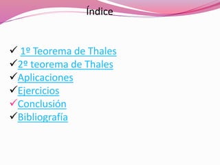 Este documento presenta un resumen sobre el teorema de Thales. Explica el teorema y su corolario, y da ejemplos de aplicaciones como la división de segmentos en partes iguales y la proporción entre dos segmentos. Incluye ejercicios de aplicación y una conclusión donde la autora reflexiona sobre lo aprendido en la materia.