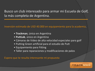 El documento propone la creación de una Escuela de Golf con equipamiento de última tecnología como Trackman y PuttLab para mejorar los servicios de enseñanza. Se detallan los cursos y equipos propuestos para adultos y menores, con énfasis en la tecnología para un análisis preciso del swing y del putting. Se invita a los clubes interesados a contactar al autor para implementar estos servicios.