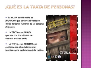 La trata de personas es una forma de migración ilegal que viola los derechos humanos y afecta a millones de víctimas anualmente. Es un proceso criminal que comienza con el engaño o coerción de las víctimas y termina con su explotación laboral o sexual. Las Naciones Unidas y otros organismos internacionales han establecido definiciones y protocolos para prevenir y sancionar este delito.