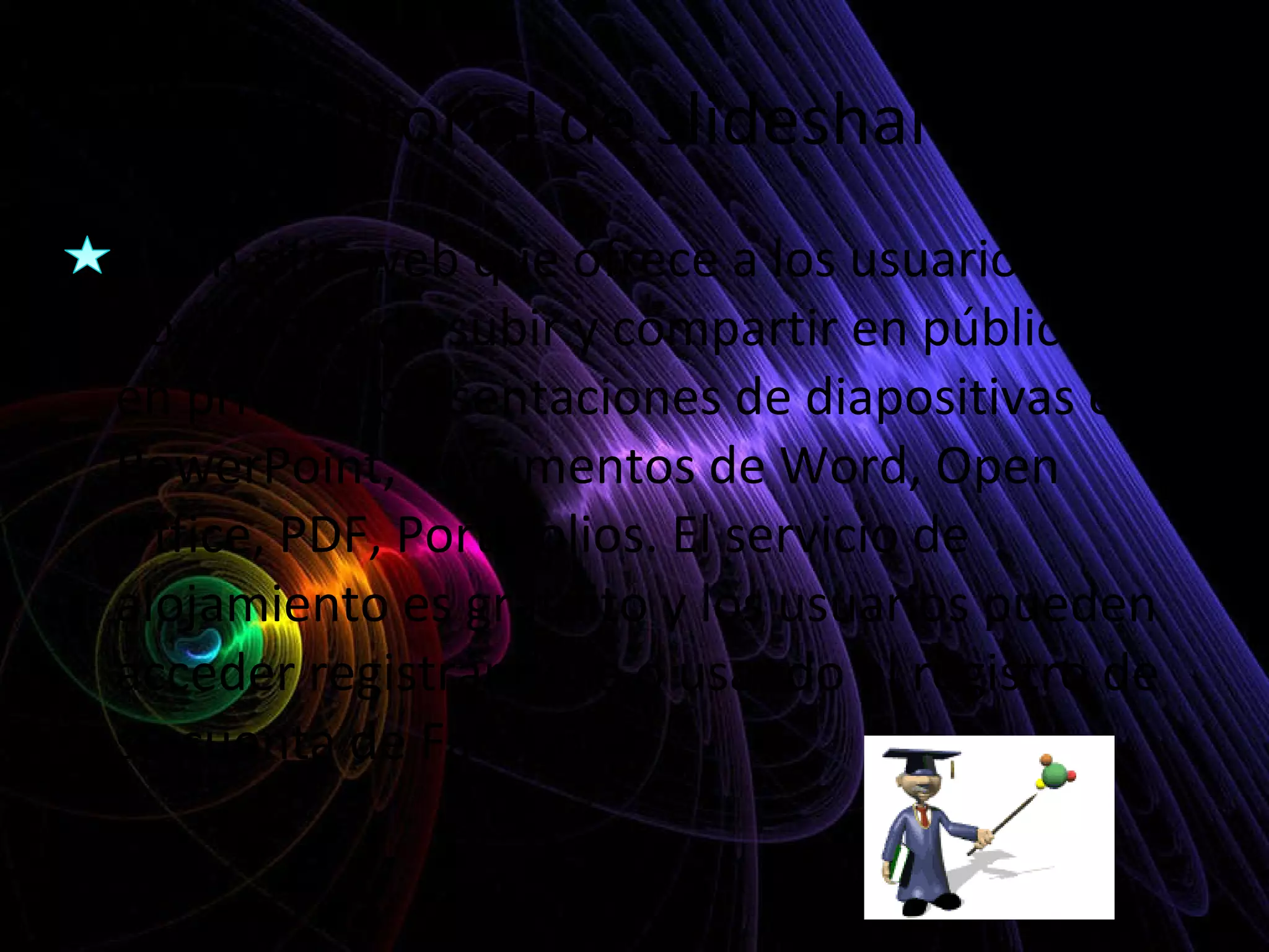 Slideshare es un sitio web gratuito donde los usuarios pueden subir y compartir presentaciones de diapositivas, documentos y PDF. Los usuarios pueden crear una cuenta de Slideshare o usar su cuenta de Facebook para acceder al servicio. Una vez registrados, los usuarios pueden adjuntar presentaciones para publicarlas de forma pública o privada y luego ver, editar y compartir sus presentaciones en Slideshare.