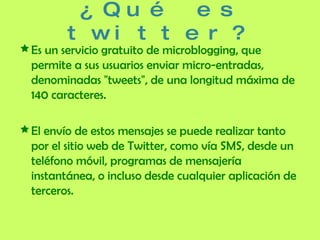 Twitter es un servicio de microblogging que permite enviar mensajes cortos (tweets) de hasta 140 caracteres. Utilizado tanto en ámbitos personales como educativos, fomenta la participación y facilita la comunicación en tiempo real. Se destacan sus aplicaciones en la educación y varias propuestas para su uso en el aula.