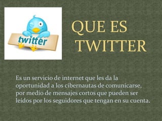 Twitter es una red social creada en 2006 por Jack Dorsey que permite a los usuarios comunicarse a través de mensajes cortos llamados tweets. Los usuarios pueden seguir a otros para leer sus tweets y compartir información e ideas. Twitter se ha vuelto popular para organizar protestas, transmitir eventos en vivo y promover debates.