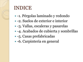 El documento describe los productos y servicios de carpintería de una empresa llamada UBRIPERGOLA, incluyendo pérgolas de madera laminada y redonda, suelos de exterior e interior, vallas, escaleras, cubiertas, sombrillas y casas prefabricadas. La empresa también ofrece servicios de carpintería general como puertas, muebles, forrados de paredes y cerramientos.