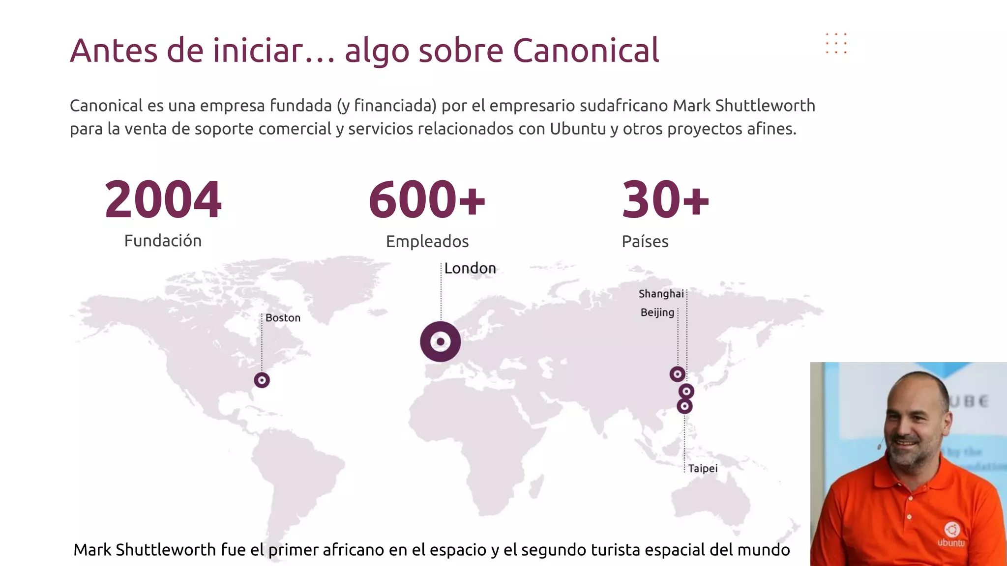 Canonical es la empresa detrás de Ubuntu, una popular distribución de Linux enfocada en la facilidad de uso. Ubuntu se basa en Debian y ha tenido 30 lanzamientos desde 2004, con nuevas versiones cada 6 meses y versiones de soporte a largo plazo cada 2 años. Existen variantes de Ubuntu como Kubuntu, Xubuntu y Lubuntu que usan diferentes entornos de escritorio.