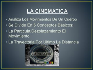 Este documento resume los conceptos básicos de la cinemática: la partícula, el desplazamiento, el movimiento, la trayectoria y la distancia. Define cada uno de estos conceptos de forma concisa. También incluye una cita de Isaac Newton sobre la variedad y la unidad en el universo.