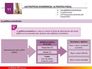 Este documento describe las políticas económicas y fiscales de un país. Explica que la política fiscal es una de las políticas económicas clave que utiliza el gobierno para influir en la economía a través de los ingresos y gastos públicos. También cubre los presupuestos generales del estado, que detallan los gastos e ingresos previstos del gobierno para un año determinado.