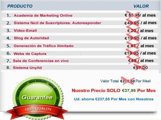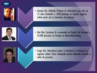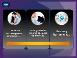 Este documento describe los servicios de una compañía de marketing online y network marketing. Ofrecen formación y herramientas para que personas generen ingresos desde casa como networkers o emprendedores online, incluyendo cursos, sistemas de suscripción, blogs, páginas de aterrizaje, generación de tráfico y salas de conferencia en vivo. La compañía tiene más de 14 años de experiencia en el sector y ha formado a miles de personas.