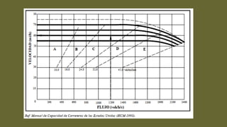 El documento describe los 6 niveles de servicio (A al F) utilizados para medir las condiciones de tráfico en una vía. El Nivel A representa condiciones de flujo libre sin demoras, mientras que el Nivel F representa congestión total con frecuentes paradas. También presenta fórmulas para calcular el flujo vehicular, la velocidad a flujo libre y ejemplos de cómo determinar el nivel de servicio actual o necesidades de diseño para lograr un nivel deseado.