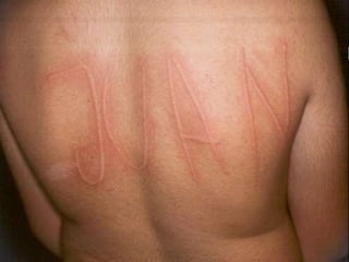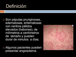 La urticaria es una enfermedad caracterizada por la aparición de pápulas pruriginosas edematosas que pueden durar desde minutos hasta días. Puede ser aguda (menor a 6 semanas) o crónica (mayor a 6 semanas). Las causas incluyen alergias, infecciones, físicas (frío, presión), autoinmune o idiopática. El tratamiento consiste en antihistamínicos para controlar los síntomas. En la mayoría de los casos la urticaria se resuelve espontáneamente en menos de un