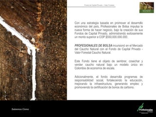 Este documento describe un fondo de capital privado para la plantación, cultivo y venta de caucho natural en Colombia. El fondo establecerá 13,000 hectáreas de plantaciones de caucho en el departamento de Vichada, con 10,000 hectáreas productivas, para un valor total de COP $130,000 millones. El fondo ofrece una rentabilidad esperada del 18% a través de la integración vertical de toda la cadena de valor del caucho natural.