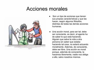 El documento trata sobre diferentes temas éticos como las acciones morales, las etapas del desarrollo moral, principios éticos como la igualdad y la justicia, y teorías éticas como el eudemonismo aristotélico, la ética hedonista, la utilitarista, y la deontología kantiana. Explica conceptos clave de la ética y compara las perspectivas de diferentes filósofos sobre la moralidad.